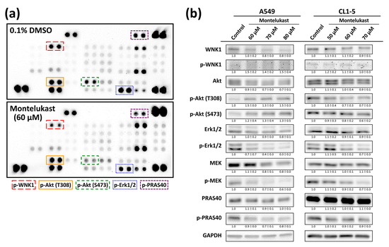 Montelukast decreased the phosphorylation of With No Lysine 1 (WNK1), protein kinase B (Akt), Extracellular Signal-Regulated Kinase 1/2 (Erk1/2), MAPK/Erk kinase (MEK), and Proline-Rich Akt Substrate of 40-kDa (PRAS40) in lung cancer cells. (a) The CL1-5 cells were treated with 0.1% DMSO (control) or 60 μM montelukast for 8 h. The levels of protein phosphorylation in the cell lysates were assessed with a Human Phospho-Kinase Array Kit; (b) The cells (A549 and CL1-5) were treated with 0.1% DMSO (control) or various concentrations of montelukast for 8 h. The phosphorylated and total protein levels in the cell lysates were assessed with an immunoblot assay. The results shown are representatives of at least three independent experiments performed on different days, along with the means ± SD of the relative expression levels to the corresponding control groups at the same time point.