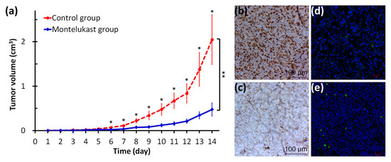 In vivo study showing the anticancer effect of montelukast. The C57BL/6JNarl (B6) mice were given either water (control group) or 100 μg of montelukast in water (treatment group) via tube feeding daily from day −3 to day 13. Each mouse was injected with 500,000 Lewis lung carcinoma (LLC) cells subcutaneously on day 0. The mice were sacrificed on day 14 and the tumor specimens were sent for a pathological exam. (a) The tumor volume was shown in mean (±standard error of mean) for each group on each day (from day 1 to day 14) and plotted. * p < 0.05, while comparing the tumor volumes in both groups on the same day. ** We adapted a mixed effect model based on the tumor volume with the effects of group, time, and their interaction, while taking into account the repeated observations of study mice. All three effects showed significantly different tumor growth [group (montelukast group vs. control group), p = 0.0369; time (in days), p < 0.0001; their interaction (growth rates of montelukast group vs. control group), p < 0.0001]; (b,c) immunohistochemical staining showed a markedly decreased Ki-67 expression in the tumor specimens from the montelukast group (c) compared to the control group (b); (d,e) confocal microscopy of the terminal deoxynucleotidyl transferase dUTP nick end labeling (TUNEL) assay showed a markedly increased number of TUNEL-positive cells in the tumor specimens from the montelukast group (e) compared to the control group (d).