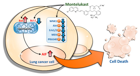 Illustration of the mechanism through which montelukast induced the cell death of lung cancer cells. Montelukast decreased the phosphorylation of several proteins, such as WNK1, Akt, Erk1/2, MEK, and PRAS40, down-regulated Bcl-2, up-regulated Bak, and induced the nuclear translocation of AIF, contributing to the cell death of lung cancer cells. (Red upward arrows: up-regulation; blue downward arrows: down-regulation)