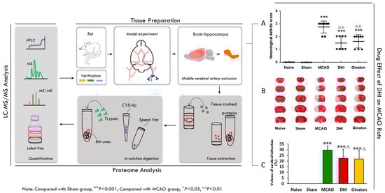 Overview of the experimental workflow. Firstly, permanent occlusion of the middle cerebral artery (MCAO) was established in rats with an intraluminal silicon-coated filament (tissue preparation). Secondly, to ensure the reliability and rationality of the rat model of cerebral ischemic injury, an initial experiment revealed the success of the establishment of focal ischemic models (A,B,C). Thirdly, the hippocampal region of the model brains was tissue crushed and the protein extracted, after injury time of 24 h in focal ischemic models (tissue preparation). Fourthly, proteins for proteome analysis were tryptic digested in solution, desalted using a C18 pre-column, and subjected to LC and Q-Exactive analysis (proteome analysis). Finally, the peptide mixture was analyzed with online reverse-phase chromatography and mass spectrometry and a label-free approach was used for the quantitative analysis (LC-MS/MS Analysis). (A) The results of neurological deficits Score shown that DHI and Ginaton can improve neurological function in MCAO rats after 24 h ischaemic injury (Table 1, the date was tested by a rank sum test); (B,C) 2% TTC staining results and histogram shown that DHI and Ginaton can decrease the volume of cerebral infraction in MCAO rats. The results of TTC were tested by one way ANOVA and multiple testing (Table 2).
