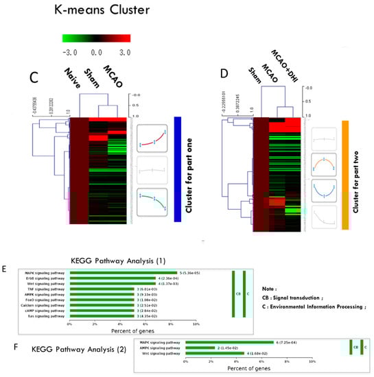 For part two, we used the same method of hierarchical and K-means clustering to filter the 184 significant commonly expressed proteins (Table S1, Sheet 7: Cluster for part two). Four clusters can be observed and only two important clusters were used for our next analysis, one in which the protein expression level first increased and then decreased and another in which the expression level was first decreased and then increased. In the former cluster, the expression of 16 proteins increased in the MCAO group compared to the Sham group and then decreased in the MCAO + DHI experimental group. In the latter cluster, the protein expression was higher in the Sham and MCAO + DHI groups and downregulated in the MCAO group. This second cluster includes less than one-tenth (17) of the significantly altered proteins. (Figure 3D).