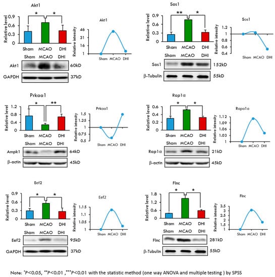 To select candidate proteins for validation, we first reviewed the quantitative data and biological information analysis of the proteins to confirm their differential expression at the protein level in the four experiment groups. The selected proteins met our subcellular localization and pathway enrichment criteria as being truly “extracellular region” proteins and belonging to “WNT signalling”, “MAPK signalling” or “AMPK signalling” KEGG pathways. Thus, we narrowed our list down to twelve proteins, including the following: Glypican 4 (Gpc4), Adenomatous polyposis coli protein (Apc), Glycogen synthase kinase-3β (Gsk-3β), Casein kinase I isoform gamma-1 (Csnk1 g1), C-terminal-binding protein 2 (Ctbp2), Anti-α Smooth muscle actin (Acta2), RAC-α serine/threonine-protein kinase (Akt1), Elongation factor 2 (Eef2), 5′-AMP-activated protein kinase catalytic subunit α-1 (Prkaa1), Protein Sos1 (Sos1), Ras-related protein Rap-1 A (Rap1a) and Filamin-C (Flnc). Among these proteins, Glycogen synthase kinase-3β encoded by the Gsk-3β gene was previously reported to be associated with cerebral ischaemic injury []. To further validate the regulation of protein levels, we examined the protein abundance via western blotting. Quantity One software was then used to evaluate the Western blotting results by the gray value feature and β-actin, β-tublin and Glyceraldehyde-3-phosphate dehydrogenase (Gapdh) were selected as the loading controls because they are expressed equally in the samples. All of the western blotting WB experiments were repeated five times. The statistical results of Western blotting showed a significant difference (bar charts in Figure 4 and Figure 5).The mean and standard deviation were listed in Table 3. Of the 12 selected proteins, nine exhibited high expression in the MCAO group and low expression in the Sham and MCAO + DHI groups. One protein (Ctbp2) exhibited high expression in the MCAO and MCAO + DHI groups and low expression in the Sham group. The other two proteins displayed high expression in the Sham and MCAO + DHI groups and median expression in the MCAO group (Figure 4 and Figure 5; Table 3). These expression results coincided with the injury and repair capability of the hippocampus after cerebral ischaemic injury. In addition, many studies have suggested that correctly identified protein candidates should participate in relevant interactions. Compared the Western blotting results with the MS label-free expression individually, as expected, the Western blotting results of all 12 proteins indicated gradual expression among the three experimental groups, which was consistent with the label-free results by MS (line graphs in Figure 4 and Figure 5), lending significant confidence to the next validation step.