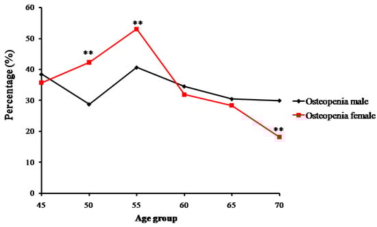 | 70 | 10 | 58.79 ± 5.17 | 11 | 52.58 ± 2.03 ** |