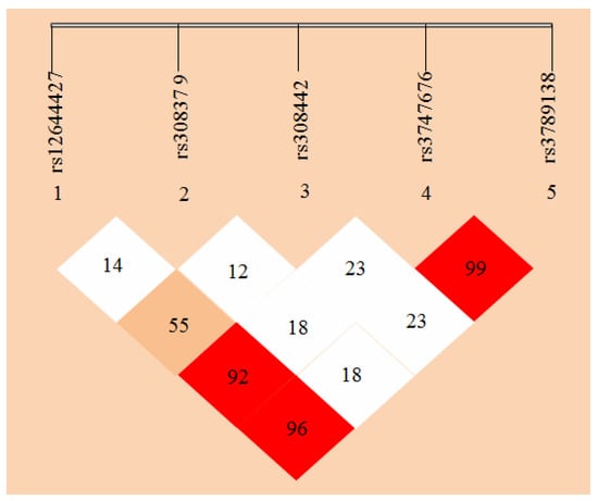 4.3. Linkage Disequilibrium (LD) Analyses on the Five SNP Loci of FGF-2 Gene