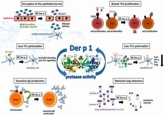 - Ghaemmaghami, A.M.; Gough, L.; Sewell, H.F.; Shakib, F. Proteolytic activity of the major dust mite allergen Der p 1 conditions dendritic cells to produce less interleukin-12: Allergen-induced Th2 bias determined at the dendritic cell level. Clin. Exp. Allergy 2002, 32, 1468–1475. [Google Scholar] [CrossRef] [PubMed]
