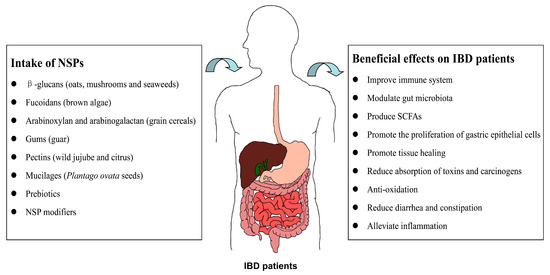 As described above, the major source of NSPs are plants, especially the endospermic cell wall of multiple kinds of seeds, fungi, and algae [], and they form a rigid structure surrounding plant cells and thus avoid being hydrolyzed by the digestive enzymes in the human small intestine, but are instead fermented by microorganisms to produce short chain fatty acids (SCFAs) beyond the small intestine. Various types of NSPs possess different properties and therefore exert different health impacts on intestinal diseases. Potential benefits include reducing diarrhea and constipation, promoting tissue healing, enhancing immune ability, relieving inflammation, producing SCFAs, and reducing the absorption of carcinogens. Through these means, NSPs can alleviate the symptoms of IBD patients and further decrease the risk of colorectal cancer (CRC) [,,].