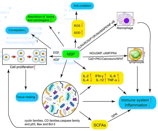 Although great efforts have been made to study the pathogenesis of IBD, its precise etiology still remains unrevealed and is generally believed to be associated with multiple elements, including genetic background, environment, microorganism, and immunity []. The interaction among the disorder of the microbial constitution, the intestinal mucosal barrier, and the mucosal immune system are believed to play a vital role in the pathologic process of IBD. We summarized the possible molecular mechanisms of NSPs affecting the maintenance and recovery of IBD in the following Figure 2 and Figure 3.
