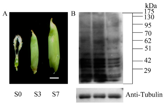 (A) Seed morphology of the pistil (S0), seed at three DAP (Day after pollination) (S3) and seven DAP (S7) from left to right. Scale bar = 2 mm; and (B) Western blot analysis of the acetylation dynamics in early rice seed development by using anti-acetyl lysine antibodies. Equal amount of proteins (20 µg) were used and the sample order from left to right: S0, S3 and S7. Anti-tubulin was used as an internal control for normalization. Molecular mass markers were shown (kDa).