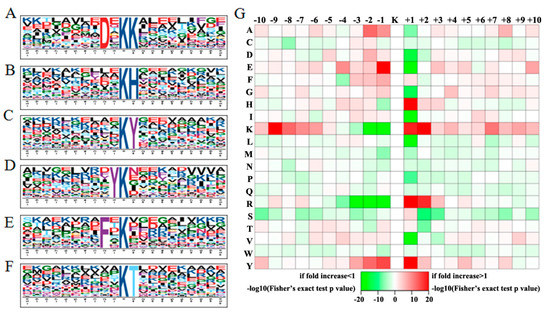 (A–F) Motif-X analysis of over-represented motifs around the acetylsites of the identified rice seed acetylproteins: A, (DxkK); B, (Kh); C, (kY); D, (Yk); E, (Fxk); F, (kT); and (G) Icelogo heat map of the 21 amino acid compositions of the acetylated site showing the frequency of the different amino acids in specific positions flanking the acetylated lysine. The different colors of blocks in (G) represent the preference of each residue in the position of a 21 amino acid-long sequence context.