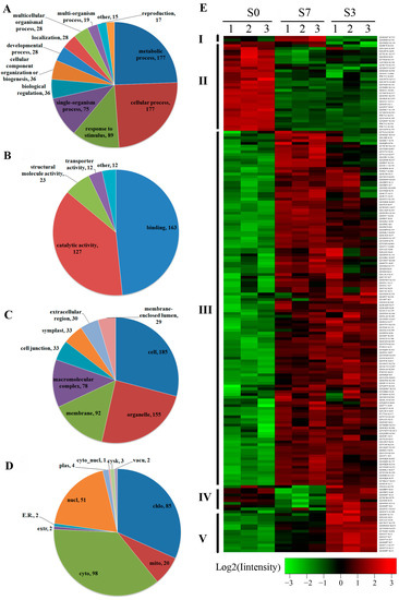 GO analysis of differentially acetylated proteins in terms of: biological process (A); molecular function (B); cellular component (C); and subcellular location (D), and (E) acetylation quantitation heat map of differentially acetylated (DA) proteins in S0, S7 and S3. The sample order from left to right: S0, S7 and S3. Color bar at the bottom represents the log2 acetylation site quantitation values. Green, black and red indicate the low, medium and high acetylation intensity, respectively. The abbreviations in (D) represent as follows: E.R.: endoplasmic reticulum; extr: extracellular matrix; cyto: cytoplasm; mito: mitochondrial; chlo: chloroplast; vacu: vacuole; cysk: cytoplasmic skeleton; cyto_nucl: cytoplasm nuclear; plas: plasma membrane; nucl: nuclear.