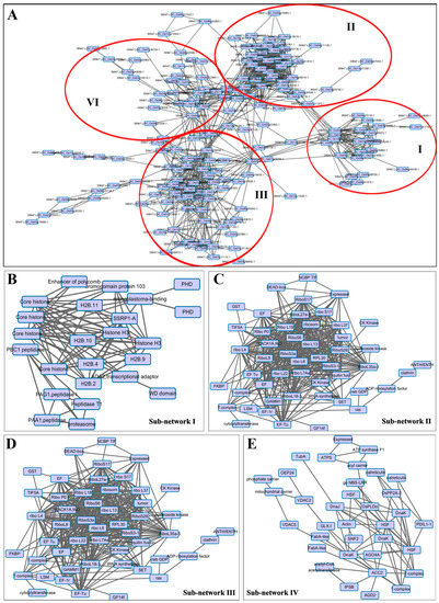 Protein–protein interaction (PPI) network of DA proteins identified in this study. (A) the whole PPI network of all DA proteins; the red circles represent the sub-network groups of DA proteins; (B) sub-network I of DA proteins associated with histone proteins; (C) sub-network II of DA proteins associated with ribosomal proteins; (D) sub-network III of DA proteins involved in glycometabolism and photosynthesis; and (E) sub-network IV of DA proteins associated with the enzymes catalyzing PKA.