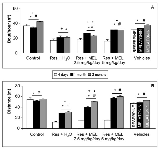 Voluntary locomotor activity. The graphs summarize: the number of spontaneous bouts (A); and the distance travelled expressed in meters (B) of all experimental groups, evaluated during 1 h of spontaneous locomotor activity. ANOVA, two-way analysis of variance; * p ≤ 0.05 vs. Reserpine four days; # p ≤ 0.05 vs. Reserpine plus tap water; + p ≤ 0.05 vs. Reserpine plus melatonin 5 mg/kg/day for 2 months and ° p ≤ 0.05 vs. Controls. H2O: tap water; MEL: melatonin; Res: reserpine.