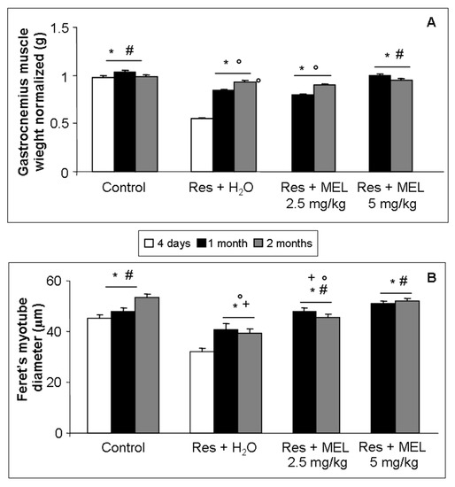 Skeletal muscle atrophy. The graphs summarize: the gastrocnemius muscle weight, normalized to body weight, expressed in grams (A); and the Feret’s myotube diameter of gastrocnemius skeletal muscle, expressed in µm (B). ANOVA, two-way analysis of variance; * p ≤ 0.05 vs. Reserpine four days; # p ≤ 0.05 vs. Reserpine plus tap water; + p ≤ 0.05 vs. Reserpine plus melatonin 5 mg/kg/day for 2 months and ° p ≤ 0.05 vs. Controls. H2O: tap water; MEL: melatonin; Res: reserpine.