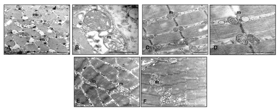 Skeletal muscle ultrastructure. Transmission electron microscopy photomicrographs of: reserpine-induced myalgia rats (A,B); rats treated with reserpine and then with only tap water for two months (C,D); and rats treated with reserpine and then with melatonin at the dose of 5 mg/kg/day for two months (E,F). Scale bar: 1 μm. (m) identifies the mitochondria.