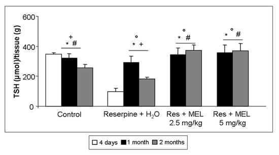 Total thiols. The graph summarizes the gastrocnemius total thiol levels of all experimental groups, expressed as µmol/grams. ANOVA, two-way analysis of variance; * p ≤ 0.05 vs. Reserpine four days; # p ≤ 0.05 vs. Reserpine plus tap water; + p ≤ 0.05 vs. Reserpine plus melatonin 5 mg/kg/day for 2 months and ° p ≤ 0.05 vs. Controls. H2O: tap water; MEL: melatonin; Res: reserpine; TSH: total thiol.
