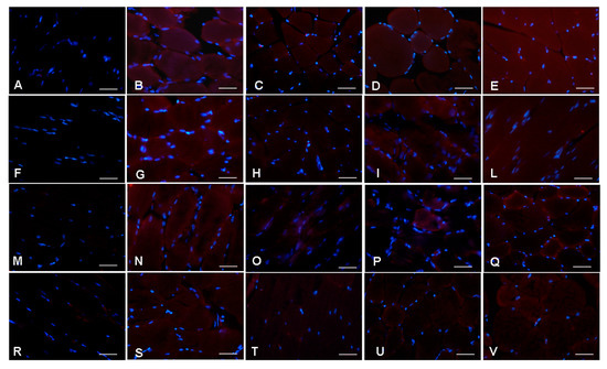 Serial paraffin sections were dewaxed in xylene, rehydrated through decreasing scale of ethanol and then washed with phosphate buffer solution 1× (PBS 1×). The blocking step was performed by incubating gastrocnemius sections with specific serum (diluted 1:50 in PBS 1×) for 1 h in a humid chamber. Subsequently, the sections were incubated 1 h at room temperature and then overnight at 4 °C in a humid chamber with the following primary antibodies: rabbit polyclonal antibody against superoxide dismutase 1 (SOD1, diluted 1:300, Santa Cruz Biotechnology Inc., Dallas, TX, USA), goat polyclonal antibody against catalase (CAT, diluted 1:200, Santa Cruz Biotechnology Inc., Dallas, TX, USA), rabbit polyclonal antibody against sirtuin3 (SIRT3, diluted 1:200, Santa Cruz Biotechnology Inc., Dallas, TX, USA), mouse monoclonal antibody against cyclooxygenase 1 (COX-1, diluted 1:100; Cayman Chemical, Ann Arbor, MI, USA) and rabbit polyclonal antibody against Nod-like receptor protein 3 antibody against (NLRP3, diluted 1:650, Novus Biologicals, Milano, Italy). Sections were then washed in PBS 1× and labelled using specific conjugated secondary antibodies (diluted 1:200 in PBS 1×; Invitrogen, Paisley, UK): goat anti-rabbit Alexa Fluor-488, goat anti-rabbit Alexa Fluor 546, rabbit anti-goat Alexa Fluor 546 and goat anti-mouse Alexa Fluor 546. Finally, the samples were counterstained with 4′,6-diamidino-2-phenylindole (DAPI) for 8 min [75,76]. The samples were mounted with fluorescent medium and observed with a fluorescent microscope (i50 Eclipse, Nikon, Düsseldorf, Germany) at final magnification of 400× [71]. Sections without primary antibody and in the presence of isotype-matched IgG served as negative immunofluorescent controls.