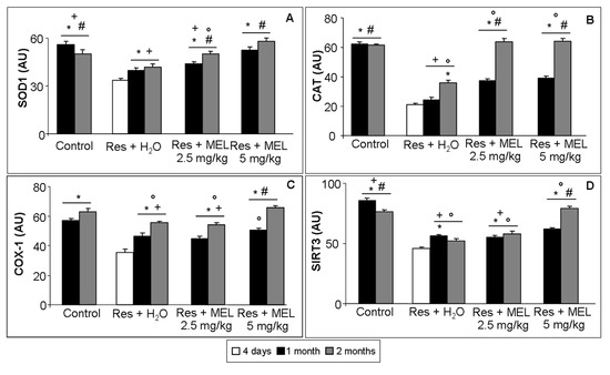 At the gastrocnemius level, we observed that the RIM experimental rats had significantly decreased expression of endogenous antioxidant enzymes (SOD1 and CAT) and of constitutive molecules, also involved in inflammatory, oxidative stress, aging and myogenesis processes (COX-1 and SIRT3) (ANOVA, p ≤ 0.05). Treatment with melatonin induced a significant increase of SOD1 expression (red staining) (ANOVA, p ≤ 0.05) and this significant enhancement was observed also after treatment with reserpine and tap water (ANOVA, p ≤ 0.05); however, treatment with 2.5 mg/kg/day of melatonin for one month did not show significant differences compared with age-related animals treated with reserpine and tap water (Figure 5A–E). The analysis of immunopositivity for CAT (red staining) showed a trend similar to that observed for SOD1, even though the melatonin beneficial effects is significantly higher after two months of treatment (ANOVA, p ≤ 0.05), but not showed difference due to the duration of treatment. Moreover, the experimental rats treated with reserpine and tap water showed a significantly lower immunopositivity compared with the animals treated with melatonin (ANOVA, p ≤ 0.05); only the rats of two months showed a significantly higher immunopositivity than the RIM experimental animals (ANOVA, p ≤ 0.05) (Figure 5F–L).