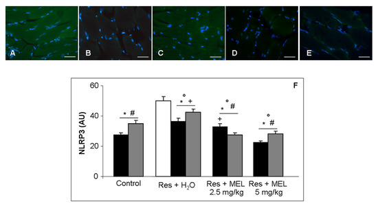 Skeletal muscle inflammatory markers. Immunofluorescence photomicrographs of gastrocnemius muscle inflammosome NLRP3 expression of: reserpine-induced myalgia rats (A); controls (B); rats treated with reserpine for two months (C); rats treated with reserpine plus melatonin at the dose of 2.5 mg/kg/day for two months (D); and rats treated with reserpine and then with melatonin at the dose of 5 mg/kg/day for two months (E). Nuclei were stained with DAPI (blue). Scale Bar: 20 µm. The graph summarizes the histomorphometrical analyses, expressed in arbitrary units (AU), of inflammosomeNLRP3. ANOVA, two-way analysis of variance; * p ≤ 0.05 vs. Reserpine four days; # p ≤ 0.05 vs. Reserpine plus tap water; + p ≤ 0.05 vs. Reserpine plus melatonin 5 mg/kg/day for 2 months and ° p ≤ 0.05 vs. Controls. H2O: tap water; MEL: melatonin; Res: reserpine.