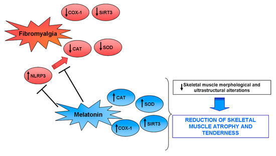 The results provide evidence that melatonin, dose and duration of treatment dependently, reduced significantly the difficulties in spontaneous motor activity, alterations in musculoskeletal cytoarchitecture and induction of inflammatory and oxidative stress processes. Regarding the effect of melatonin on the inflammosome NLRP3, we report that its expression is significantly attenuated. Thus, we suggest that melatonin may be useful for minimizing the pathological processes related to FM disease.