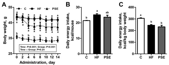 Body weight changes (A); mean energy intake per mouse (B); and per kg body weight (C) of 16-week HF diet-induced obese C57BL/6 mice after being treated with PSE for two weeks. Data are presented by means ± SEMs; n = 8 per group (A); and n = 10 per group (B,C). Body weight among groups was analyzed by two-way repeated-measures ANOVA with between (groups) and within (days) subject factors, and data on each day were compared by one-way multivariate ANOVA with Bonferroni post hoc test. Multiple comparisons of energy intake were analyzed by one-way ANOVA with Bonferroni post hoc test. Labeled means (B,C); or means on one day (A) without a common letter significantly differ at p < 0.05 (a > b). C, control; HF, high-fat; PSE, Plantago asiatica L. seed extract.
