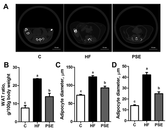 Computed tomography scans at 8 mm above the top of the iliac bone (A); abdominal WAT ratios (B); diameters of white adipocytes (C); and brown adipocytes (D) of 16-week HF diet-induced obese C57BL/6 mice after treatment with PSE for two weeks. Data are presented as means ± SEMs; n = 4 per group (B); and n = 8 per group (C,D). One-way ANOVA with Bonferroni post hoc test was used for statistical analysis. Labeled means without a common letter significantly differ at p < 0.05 (a > b > c). WAT, white adipose tissue.