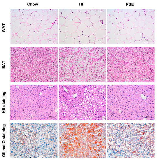 Histological analysis of liver, WAT, and BAT after two weeks of PSE treatment in 16-week HF diet-induced obese C57BL/6 mice. Liver tissue sections were stained with oil red O or H&E (×200) to observe liver lipid content. WAT and BAT were stained with H&E (×200) to observe adipocyte size. BAT, brown adipose tissue; H&E, hematoxylin and eosin. Scale bar: 100 µm.