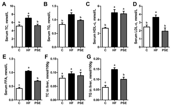 Serum TC (A); TG (B); HDL-c (C); LDL-c (D); FFA (E); liver TC (F); and liver TG (G) concentrations in 16-week HF diet-induced obese C57BL/6 mice after PSE treatment for two weeks. Data are presented as means ± SEMs; n = 8 per group. Statistical analyses were performed by one-way ANOVA with Bonferroni post hoc test. Labeled means without a common letter significantly differ at p < 0.05 (a > b > c). FFA, free fatty acid; HDL-c, high density lipoprotein cholesterol; LDL-c, low density lipoprotein cholesterol; TC, total cholesterol; TG, triglyceride.