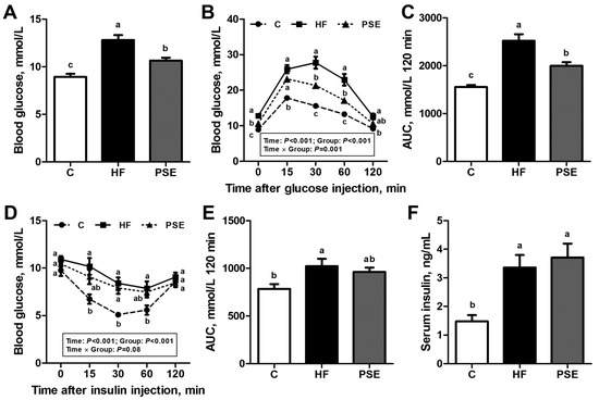 Effects of two weeks PSE treatment on glucose metabolic disorders in 16-week HF diet-induced obese C57BL/6 mice. (A) Blood glucose concentrations after 8 h of fasting at 0 min; and (B) GTT. After measuring the baseline fasting blood glucose levels, the mice were intraperitoneally injected with 1 g glucose/kg body weight and the subsequent blood glucose concentrations at 15, 30, 60, and 120 min were measured; (C) the AUC from the GTT in (B); and (D) ITT. Non-fasting blood glucose levels were measured at 0 min, and the blood glucose concentrations at 15, 30, 60, and 120 min were tested after intraperitoneal injection of 0.75 U insulin/kg body weight; (E) The AUC from the ITT in (D); and (F) serum insulin level after 8 h of fasting. Data are presented as means ± SEMs; n = 8 per group. GTT and ITT were performed by two-way repeated-measures ANOVA with between (groups) and within (minutes) subject factors, and data in each time point were compared by one-way multivariate ANOVA with Bonferroni post hoc test. Other multiple comparison analyses were performed by one-way ANOVA with Bonferroni post hoc test. Labeled means (A,C,E,F); and means at a time point (B,D) without a common letter significantly differ at p < 0.05 (a > b > c). AUC, area under the curve; GTT, glucose tolerance test; ITT, insulin tolerance test.