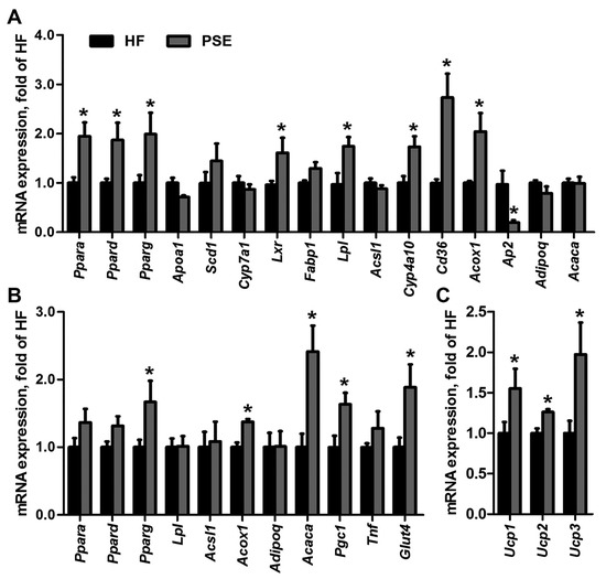 Differential gene expressions between HF and PSE groups were determined by microarray analysis and were considered significant when p value was <0.05 and the fold change was >2. The gene matrixes of HF and PSE groups (n = 3) were categorized into respective distinct clusters by hierarchical classification (Figure S3A). A total of 285 genes in PSE group were significantly different compared with those in HF group, among which 123 and 162 genes were upregulated and downregulated, respectively. Functional pathway analysis was applied in KEGG and Biocarta database, and the pathways were designated as significant when enrichment test p value was <0.05. PSE-altered genes were involved in 57 significant pathways (24 upregulated and 33 downregulated pathways). Among these pathways, three upregulated pathways (peroxisome proliferator activated receptor (PPAR) signaling pathway, fatty acid metabolism, and type II diabetes mellitus), and 10 downregulated pathways (steroid biosynthesis, mitogen-activated protein kinase (MAPK) signaling pathway, terpenoid backbone biosynthesis, retinol metabolism, sterol regulatory element-binding protein (SREBP) control of lipid synthesis, fatty acid biosynthesis, regulation and function of carbohydrate-responsive element-binding protein (ChREBP) in liver, synthesis and degradation of ketone bodies, primary bile acid biosynthesis, and vascular smooth muscle contraction) were associated with liver function, cholesterol synthesis and degradation, fatty acid metabolism, glucose homeostasis, and blood pressure regulation (Figure S3B). PPARs play essential roles in energy metabolism, fatty acid/cholesterol synthesis and transport, and have been recognized as drug targets for metabolic diseases. PPARs have three subtypes, namely PPARα, PPARβ/δ, and PPARγ, which show different distributions and specific functions. Therefore, a reporter assay was performed to analyze the effects of PSE on the transcription activities of PPARα, PPARδ, and PPARγ. PSE alone at 200 μg/mL increased PPARα and PPARγ transactivities (p = 0.046, p = 0.039), but were not as strong as when the agonists alone were used (p < 0.001, p < 0.001). PSE at 200 μg/mL combined with agonists significantly activated PPARα and PPARγ transcriptions (p < 0.001, p = 0.002) compared with the agonists alone, which indicated that PSE may have a strong synergistic effect with the agonists (Figure S4). However, PSE displayed no effect on PPARδ transactivities. The result indicated that PSE may contain agonists of PPARα and PPARγ. Furthermore, we evaluated the mRNA expression levels of PPARs and related target genes in liver, WAT, and brown adipose tissue (BAT) of mice in the HF and PSE groups. The mRNA expression levels of Ppara (p = 0.006), Ppard (p = 0.027), Pparg (p = 0.045), and their target genes, including liver X receptor α (Lxr) (p = 0.043), lipoprotein lipase (Lpl) (p = 0.018), cluster of differentiation 36 (Cd36) (p = 0.006), cytochrome P450 4a10 (Cyp4a10) (p = 0.010), and acyl-Coenzyme A oxidase 1 (Acox1) (p = 0.021), in liver tissues in the PSE group were significantly greater than those in the HF group. However, the hepatic expression of fatty acid binding protein 4 (Ap2) was suppressed (p = 0.013) (Figure 6A). Moreover, PSE administration increased the mRNA expression levels of Pparg (p = 0.049), Acox1 (p < 0.001), acetyl-Coenzyme A carboxylase α (Acaca) (p = 0.004), PPAR gamma coactivator 1 α (Pgc1) (p = 0.017), and glucose transporter 4 (Glut4) (p = 0.031) in WAT of HF diet-induced obese mice (Figure 6B). We also analyzed the gene expressions of thermogenic markers uncoupling protein 1 (Ucp1), Ucp2, and Ucp3 in BAT of HF and PSE groups. As shown in Figure 6C, the expression levels of Ucp1 (p = 0.046), Ucp2 (p = 0.001), and Ucp3 (p = 0.041) in HF diet-induced obese mice were greatly upregulated after PSE treatment. These results suggested that PSE likely improved lipid and glucose metabolism by enhancing PPAR signaling.