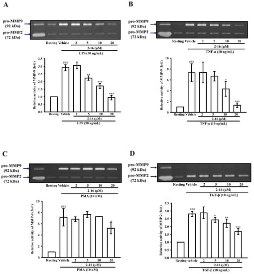 2.2. The Effects of WK2-16 on MMP-9-Mediated Gelatinolysis Induced by LPS, TNF-α or PMA and MMP-2-Mediated Gelectinolysis by TGF-β