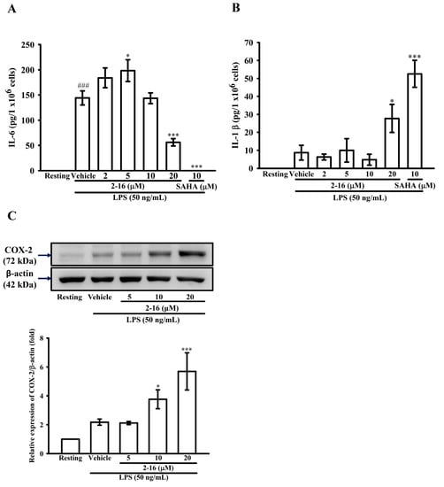 2.4. WK2-16 Down-Regulates IL-6 Levels but Enhances Cyclooxygenase (COX)-2 Expression