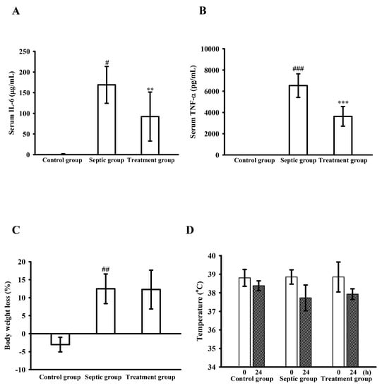 - Leon, L.R.; White, A.A.; Kluger, M.J. Role of IL-6 and TNF in thermoregulation and survival during sepsis in mice. Am. J. Physiol. 1998, 275, R269–277. [Google Scholar] [PubMed]