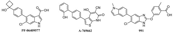More recently, a direct AMPK activator PF-06409577 was reported to activate α1β1γ1 and α2β1γ1 AMPK isoforms with EC50 of 7.0 nM and 6.8 nM but was much less active against α1β2γ1/α2β2γ1/α2β2γ3 AMPK isoforms with EC50 greater 4000 nM [6]. Besides, compound PF-06409577 exhibited efficacy in a preclinical model of diabetic nephropathy. Compounds A-769662 and 991 possessed similar potency toward AMPK heterotrimers containing a β1 subunit as PF-96409577 [15]. On the other hand, an allosteric site of AMPK has been named allosteric drug and metabolite site (ADaM site) [16], which was constructed by the catalytic kinase domain (KD) of α subunit and the regulatory carbohydrate-binding module (CBM) of β subunit [13,17]. The three known direct AMPK activators (PF-06409577 [6], A-769662 [18], and 991 [19], Figure 1) all bound to the allosteric site and showed better potency for isoforms that contain the β1 subunit. This implies that the allosteric site can be used to design the selective activators of AMPK containing the β1 subunit.