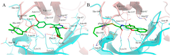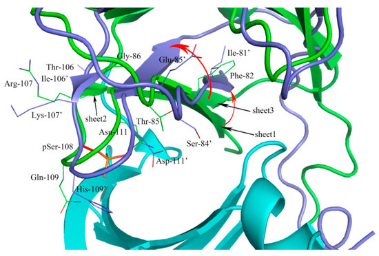 The sheet 2 torsion may attribute to the amino acid sequence differences of the sites of 106 and 107. The most notable is supposed to the Ser108 (red and stick), an autophosphorylation site, phosphorylated serine (pSer108) formed hydrogen bonds with Thr-21, Lys-29, Lys-31, His-109′, and Asn-111′ enhancing the ADaM site stabilization [22], and the phosphate group contributed to the binding of activators [23]. The Gln-109′ and Asn-111′ were mutated to His-109′ and Asp-111′, which abolished original hydrogen bonds and generated a large conformational change. We speculated that the above differences between β1 and β2 may affect the binding of activators to AMPk isoforms.