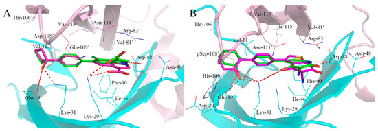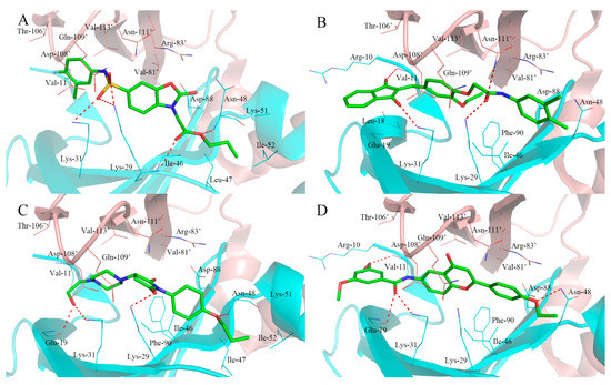 As shown in Figure 6A, the compound F064-1335 with the highest docking score (10.50) formed several hydrogen bonds with active site residues. The two oxygen atoms of sulfonamide established a hydrogen bond network with the side chain of Lys-31, Lys-29, and Asn-111′. The carbonyl oxygen atom of the ester group formed two hydrogen bonds with the main chain of Lys-29, the anther oxygen atom of the ester group was bound to the main chain of Asn-48 by a hydrogen bond, which made the alkoxy group trend into a hydrophobic pocket formed by the Lys-51, Ile-52, Val-62, and Leu-47. In addition, the carbonyl oxygen of benzoxazolone ring formed a hydrogen bond with the side chain of Arg-83′.
