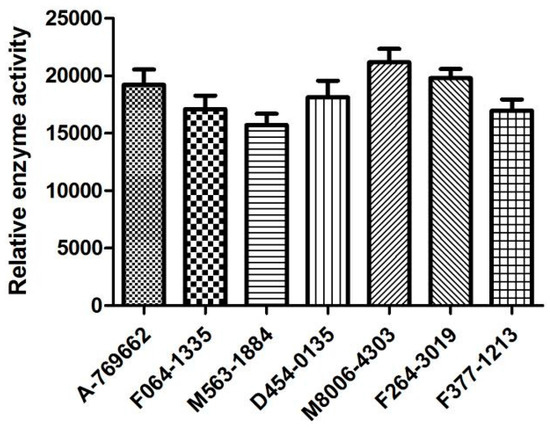 The six screened compounds based on α1β1γ1 AMPK isoform were evaluated for activities against AMPK (α1β1γ1 isoform) at a dosages of 2 µM. A-769662, a known β1-selective AMPK activator, was used as a control. The preliminary in vitro assay (Figure 9) indicated that most of the selected α1β1γ1 AMPK activators displayed promising activation potency against α1β1γ1 AMPK isoform. Compounds D454-0135 and F264-3019 displayed comparable activation activity against AMPK in the comparison with the known β1-selective AMPK activator A-769662. Morever, compounds M8006-4303 and F264-3019 showed stronger activation activities against α1β1γ1 AMPK than A-769662. Compound M563-1884 with a higher logP value and showed a relatively low activation activity among the assayed compounds. This implies that the lipophilicity may play an important role in the bioavailability for the compound.