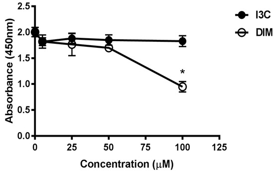 Assessment of cell viability following treatment with different doses of Indole-3-Carbinol (I3C) and Dimer Diindolylmethane (DIM) in Jurkat cells. Jurkat cells were plated at a density of 4 × 10−5 cells/mL in a 96 well plate overnight. Cells were treated with varying doses of I3C or DIM for 48 h and cell viability was assessed using CCK8 kit following manufacturer’s instructions. Results expressed as mean ± SD (n = 3) from three independent experiments. * indicates significantly different compared to control (0.1% dimethyl sulfoxide (DMSO) at p < 0.05 (One-Way Anova).