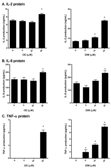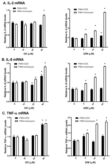 In contrast, DIM exhibited a dose-dependent increase in IL-2 mRNA expression, only upon PMA/ionomycin stimulation. Similarly, I3C and DIM markedly increased PMA/ionomycin-mediated IL-8 and TNF-α expression, while minimal changes in IL-8 and TNF-α were observed upon PMA/anti-CD3 stimulation (Figure 2B,C). Of note, I3C, only at 50 µM, showed maximal induction of these pro-inflammatory cytokines, whereas DIM showed a dose-dependent effect.