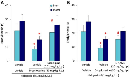 Effects of dizocilpine or L-NG-Nitro-l-arginine methyl ester (L-NAME) on the ameliorative action of d-cycloserine (DCS) against haloperidol (HAL)-induced bradykinesia. (A,B) Mice received dizocilpine (0.01 mg/kg, i.p.), L-NAME (10 mg/kg, i.p.), or vehicle simultaneously with DCS (30 mg/kg, i.p.) or vehicle 15 min before the HAL injection (1 mg/kg, i.p.). The pole test was performed 30 min after the HAL injection. Each column represents the mean ± S.E.M. of 12–23 mice. These data were analyzed using the Mann-Whitney U-test. * p < 0.05: Significantly different from the value with HAL alone. # p < 0.05, significantly different from the value with HAL + DCS.