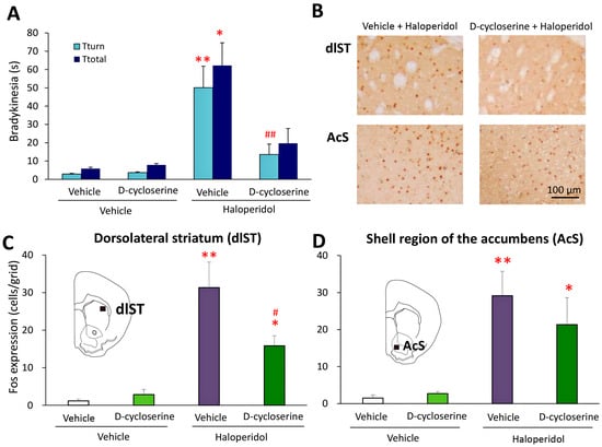 It is well-known that HAL evokes Fos protein expression, a biological marker of neural excitation [], in the forebrain (e.g., striatum and nucleus accumbens) via dopamine D2 receptor blockade [,]. Therefore, we examined the effects of an anti-bradykinetic dose of DCS on HAL-induced Fos expression in the dorsolateral striatum (dlST) and shell region of the nucleus accumbens (AcS).