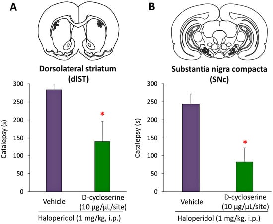In order to investigate the action sites of DCS, we conducted microinjection studies using rats. DCS (10 μg/site) or vehicle was microinjected into the bilateral substantia nigra pars compacta (SNc) or dlST 15 min after the HAL (1 mg/kg, i.p.) treatment. HAL-induced EPS was evaluated by the catalepsy test 30 min after the HAL injection. Under these conditions, microinjections of DCS into the SNc or dlST significantly attenuated HAL-induced catalepsy (Figure 4). The catalepsy time with HAL was significantly reduced from 243.6 ± 28.0 to 82.7 ± 39.9 (SNc: U = 17, p = 0.0123) and 283.8 ± 16.2 to 140.5 ± 56.0 (dlST: U = 7, p = 0.0495) by the microinjection of DCS into the SNc and dlST, respectively.