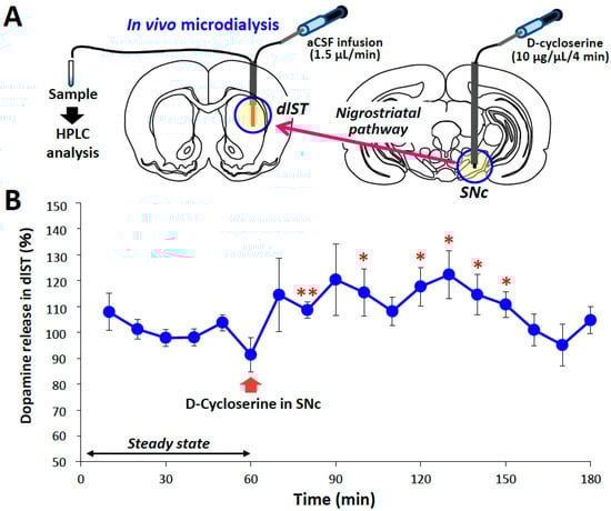 Effects of an intranigral microinjection of d-cycloserine (DCS) on dopamine release in the rat striatum. (A) Schematic drawing illustrating the microinjection site of DCS in the substantia nigra pars compacta (SNc) and microdialysis site in the dorsolateral striatum (dlST); (B) Extracellular levels of dopamine were analyzed in 10-min dialysate samples. Data were normalized to the mean value of the first six 10-min samples (basal value). Each column shows the mean ± S.E.M. of 6 rats. These data were analyzed by the Student’s t-test. * p < 0.05, ** p < 0.01, significantly different from the basal value.