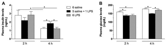 To evaluate whether long-term endotoxemia stimulates insulin secretion and insulin signaling in the hypothalamus, rats were treated with repeated LPS injections in comparison with single LPS treatment. Plasma insulin levels were increased 4 h after single, but not repeated LPS treatment (Figure 1A). Coupled to this response, glucose levels were reduced in single LPS treated rats (Figure 1B) at that time. Insulin secretion following acute LPS administration has been previously described [22]. The release of insulin during the infection process is an adaptive response to the increased production of cytokines [22,23,24]. Because repeated exposure to endotoxins leads to a desensitization of the neuroendocrine and immunological systems [25], the unaltered insulin levels in the 6 LPS group, compared with the controls, indicates a tolerance to the LPS effects.