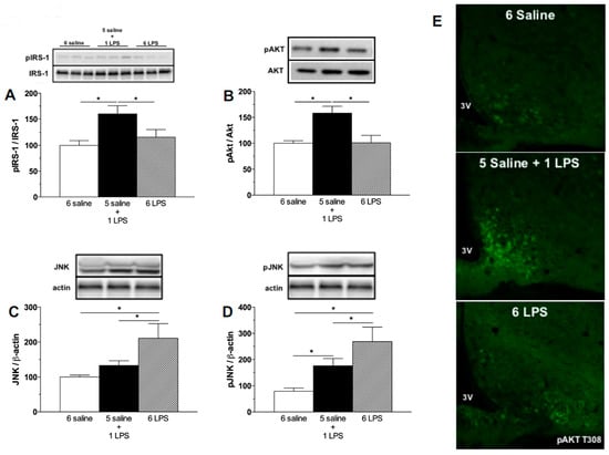 Acute endotoxemia increases phosphorylation of insulin signaling proteins whereas prolonged endotoxemia induces higher expression of the inhibitor of insulin cascade signaling, c-Jun N-terminal Kinase (JNK). Percentage of Phospho-Insulin receptor substrate-1 (pIRS1) (A), Phospho-Protein kinase B (pAKT) (B), JNK (C), and Phospho-c-Jun N-terminal Kinase (pJNK) (D) expression in the mediobasal hypothalamus of saline (6 saline), single (5 saline + 1 LPS, 100 ug/kg ip), or repeated LPS (6 LPS) treated-animals. The representative results of two independent experiments (n = 6–8/group) are shown with the measurements performed with samples from the same animal. One-way ANOVA, followed by Fisher post hoc test was performed. Data are expressed as means ± SE. Differences were accepted as significant at * p < 0.05; (E) representative photomicrographs showing the pAKT T308 expression (green) in neurons from the arcuate (ARC) nucleus of the hypothalamus of animals treated with 6 saline, 5 Saline + 1 LPS, and 6 LPS injections. 3V, third ventricle. Objective: 40×.