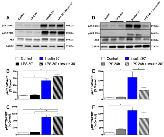 Prolonged exposure to LPS impairs insulin signaling in hypothalamic neurons in vitro. Percentage of pAKT S473 (A) and pAKT T308 (B) in the mouse GT1–7 cell line after saline (control), short (30′) LPS (1 μg/mL), insulin (100 mM/mL), or LPS (30′) + insulin treatment. Percentage of pAKT S473 (E) and pAKT T308 (F) in the mouse GT1–7 cell line after saline (control), prolonged (24 h) LPS (1 μg/mL), insulin (100 mM/mL), or LPS (24 h) + insulin treatment. In Vitro experiments were performed in 3–4 different assays. One-way ANOVA, followed by the Fisher post hoc test were performed. Data are expressed as means ± SE. Differences were accepted as significant at * p < 0.05.