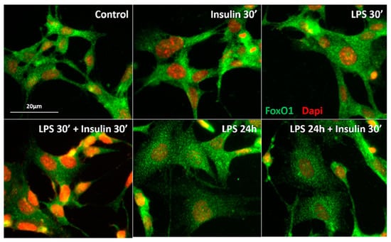 As previously mentioned, the expression of toll-like receptors in neurons is undetermined [27]. However, it was reported that the GT1-7 cell line, derived originally from immortalized hypothalamic neurons, expresses toll like receptors and presents increased interleukins and tumor necrosis factor (TNF)-α mRNA expression after inflammatory stimulus with LPS [34]. To confirm whether long-term exposure to LPS impairs insulin signaling in neurons, we performed in vitro experiments in which we treated GT1-7 cells with LPS for short (30′) or long (24 h) periods, followed by treatment with insulin. LPS at both 30′ and 24 h did not induce pAKT expression in GT1-7 cells. As expected, cultured cells exhibited an increased AKT phosphorylation at both the S473 and T308 residues after insulin treatment. Short-term exposure to LPS (30 min) did not affect insulin-induced pAKT in these cells. Remarkably, prolonged LPS exposure (24 h) impaired the phosphorylation of AKT in both residues after insulin treatment (Figure 4). Activation of the IRS-PI3K-AKT pathway by insulin culminates with the sequestration of the Forkhead box protein O1 (FoxO1) into the cytoplasm, due to FoxO1 phosphorylation. FoxO1 mediates the anorectic effects of leptin and insulin in the ARC by regulating the transcription of POMC and AgRP [35]. We performed an in vitro qualitative study to evaluate the FoxO1 subcellular localization in GT1-7 cells under short- or long-term LPS exposure. In control cells, FoxO1 (green) is widely expressed in the whole cell. After insulin treatment, both control and LPS treated cells (30′) present a qualitatively higher FoxO1 expression predominantly located in the cytoplasm, as evidenced by a clear red DAPI nuclear staining. Short-term LPS treatment did not change FoxO1 expression/distribution in the GT1-7 cells, nor insulin-induced FoxO1 translocation from the nucleus to the cytoplasm. Interestingly, prolonged LPS treatment impaired the ability of insulin to induce the translocation of FoxO1 from the nucleus to the cytoplasm (Figure 5), evidencing the absence of insulin-induced phosphorylation and translocation of this protein to the cytoplasm. These data strongly suggest that low-grade inflammation induced by prolonged exposure to endotoxins impairs insulin signaling and leads to insulin resistant-like phenomena in the neurons.