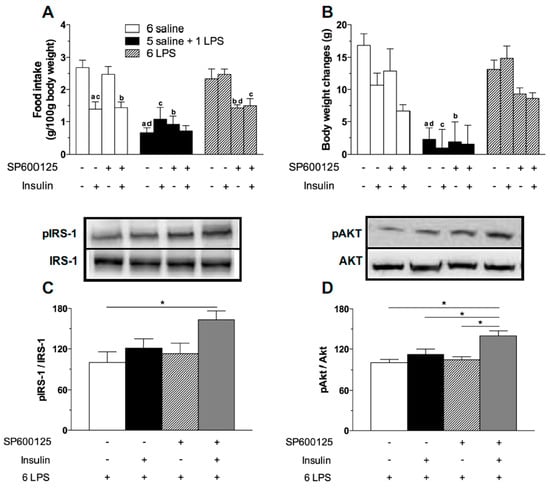 Rats implanted with a cannula in the lateral ventricle (n = 6–8/group) were assigned into the experimental groups (6 Saline, 1 LPS and 6 LPS) as described above. On the day of the experiment, food was removed at 04:00 p.m. and the rats from each group were ICV pre-treated with vehicle (saline, 5 μL) or JNK inhibitor (20 μM in 5 μL; Tocris, Ellisville, MO, USA), followed 105 min after by vehicle (saline, 5 μL) or insulin (12 μM in 5 μL) ICV injection. Food was reoffered 30 min after vehicle or insulin injection. Food consumption and body weight gain were assessed 2 and 14 h after food replacement, respectively.