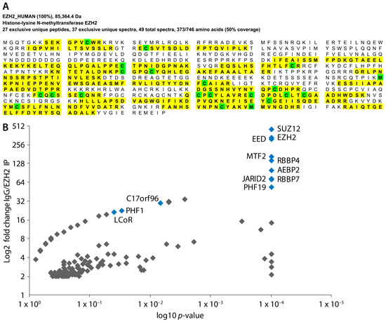 Affinity-purification mass spectrometry coverage of EZH2 and enrichment of PRC2 member proteins. (A) Sequence coverage of EZH2 (detected peptides are highlighted in yellow and amino acids with post-translational modifications are shown in green) from a representative mass spectrometry run (peptide threshold 95%); (B) Scatter plot of hits from all five mass spectrometry experiments passing a 2-fold change cut-off showing enrichment of core PRC2 components (shown in blue).