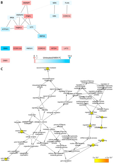 Gene ontology analysis of EZH2 interactome. (A) Gene ontology (Cytoscape–BinGO) showing significant enrichment for proteins involved in translation, RNA splicing, and gene expression. Node colour corresponds to p-value (see scale). Gene ontology analysis of EZH2 interactome (cont.); (B) Quantitative network analysis of EZH2-interacting proteins changing their relative frequency of interaction upon differentiation. Blue-coloured proteins represent ones found to co-IP with EZH2 at higher frequency in untreated HL-60 cells, whereas pink-coloured “preys” were found enriched in cells treated with AtRA; (C) Gene ontology (GO) analysis of proteins that change their interaction frequency with EZH2 upon AtRA-driven myeloid differentiation suggesting involvement in RNA metabolism, splicing, and control of gene expression.