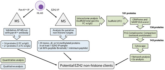 HL-60 cells were centrifuged and washed with phosphate-buffered saline (PBS). Cell lysates prepared using High-salt Lysis Buffer (20 mM HEPES (4-(2-hydroxyethyl)piperazin-1-ylethanesulfonic acid) pH 7.9; 1.5 mM MgCl2; 0.3 mM NaCl; 0.2 mM EDTA (ethylenediaminetetraacetic acid); 0.1% Triton X100; 0.1 mM DTT (dithiothreitol); 25% Glycerol). Cell lysates were pre-cleared with protein A/G magnetic beads (Pierce) and incubated overnight at 4 °C with: rabbit polyclonal anti-EZH2 antibody (Abcam, ab186006, Cambridge, MA, USA); mouse monoclonal anti-EZH2 antibody (Cell Signaling Technology, clone AC22, Danvers, MA, USA); rabbit polyclonal anti-methyl lysine antibody (Abcam, ab7315); mouse IgG (Abcam, ab37355, Cambridge, MA, USA) or rabbit IgG (Abcam, ab27478, Cambridge, MA, USA) isotype controls. Samples were then incubated for 2 h with protein A/G magnetic beads. Bound antibody-protein complexes were washed three times with Low-salt Lysis Buffer (20 mM HEPES pH 7.9; 1.5 mM MgCl2; 0.1 mM NaCl; 0.2 mM EDTA; 0.1% Triton X100; 0.1 mM DTT, three times with 50 mM TEAB (triethylammonium bicarbonate), and eluted with 5% formic acid. Any residual formic acid was neutralised with 1 M TEAB and samples were dried in vacuo. Samples were re-dissolved in 5% acetonitrile/50 mM TEAB and then reduced with TCEP (tris(2-carboxyethyl)phosphine, 5 mM final concentration). Free cysteines were alkylated with 2-choloroacetamide (10 mM final concentration). Proteins were digested with trypsin (Promega, Madison, WI, USA) and quenched with neat formic acid after 4 h. An aliquot of these solutions was taken for direct analysis by liquid chromatography tandem-mass spectrometry (LC-MS/MS).